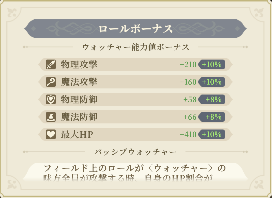 シモーナはウォッチャーロールなので、ロールボーナスも載せておきます。強化はそこそこ進んでいます。